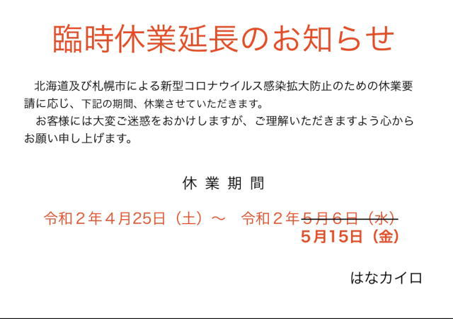 新型コロナウィルス感染拡大予防の為、休業延長のお知らせ